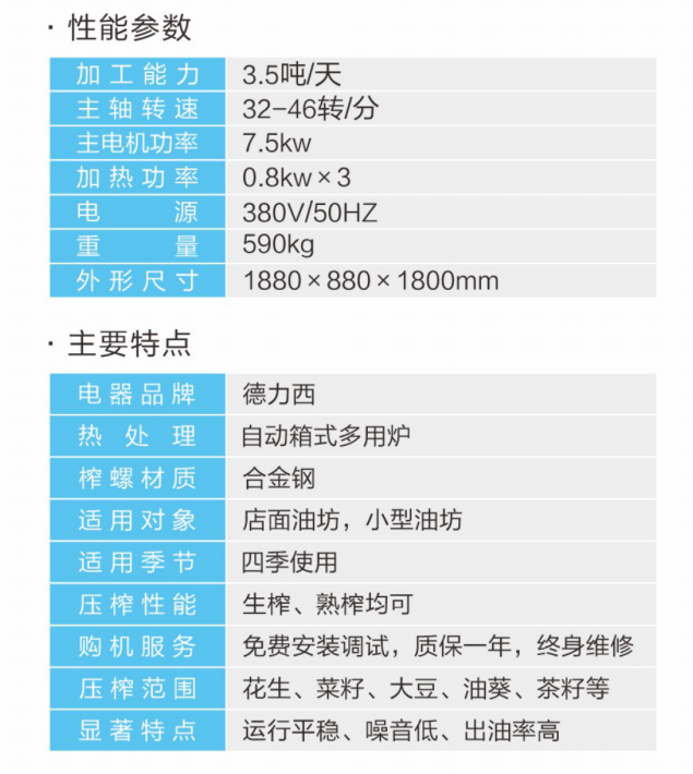 ★壓榨范圍:花生、大豆、菜籽、油葵、茶籽、芝麻等;★適用對象:店面油坊和微小油坊;★壓榨性能:熱榨一次榨盡,免費安裝調試